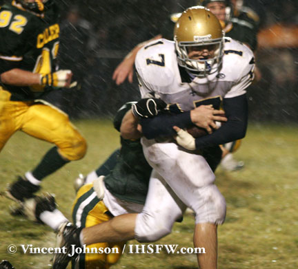 Coalers Pick Off Victory Coal City - Quarter back Justin Blaine ran in a 15 yard TD to put the Coalers up 14-7 with 36 seconds left in the 3rd. That play was set up by a Central Catholic fumble that was recovered at by Coal City around midfield. The score would would be all they would need as they went on to win 14-7. The game was all but wrapped up for the Coalers, who seen the Saints come marching down field 3 times in the 4th quarter. Twice the Saints would go for it on 4th down only to throw an incomplete pass while in the redzone. Coal City trying to maintain possession of the ball with 1:31 left in the game went for it on 4th & 1 at the 41 of Bloomington, only to be stopped. The Saints worked the ball down field to the Coaler 32 before Bernie Naiden would pick off a 2 & 10 pass at the 11 yard line with 29 seconds left in the game. Giving Coal City back the ball & a trip to the semi-final round. by Vincent Johnson