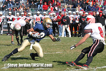 Saints Advance, Go 9-1Bloomington (Hundman Field) - The Saints beat Stillman Valley 44-13 Saturday afternoon in front of a home crowd, as Bloomington Central Catholic went 9-1 on the season and advanced to the second round of the 4A playoffs. Stillman Valley finished the season at 7-3 as they bowed out of the playoffs after one game for the second year in a row. Central will face off against last years 4A Champs Driscoll Catholic from Addison. The Highlanders set a state record last year when they won their 5th straight state title. The also hold the record for most consecutive playoff victories, with 25 and counting. by Vincent Johnson