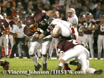 David Takes Down GoliathBy - Brian Snow In this classic battle, call Brother Rice the "David" and call St. Rita "Goliath." No one thought that David had a chance. Well, think again. Using an inspired defense which led to an efficient offensive attack, the Brother Rice Crusaders scored the biggest win to date in taking down Rita by a count of 21-7 before a crowd of nearly 11,000 at Gary Little Stadium. In the midst of a scoreless first quarter, you got the sense that the Crusaders were up to the challenge of the two-headed running attack of Darieon Hood and Clifford Moore, who coming into the game had combined for almost 1200 yards rushing. On each of the St. Rita possessions, they were held to a three-and-out. The immovable object had become just that, immovable. Rice marched down the field on their second posession, but the drive stalled at the St. Rita 10-yard line and placekicker Blake Botchnick missed a 27-yard field goal which kept the game scoreless. Rita got their kicks from kicker/punter Ryan Donahue as he boomed kicks of 64 and 57 yards in the first period and got only a combined return yardage of 8 yards by Joe Gibson. As the second quarter began, the Crusaders were still holding the Mustangs to three-and-out series and forced three more punts. Rice wasn't moving the ball at will either in the first half, but something weird happened after another Rita possession. The usually sure-footed Donahue shanked an 18-yard punt out of bounds on the right sideline and set the Crusaders up at the Rita 29. After a near connection between Evans and Gannon, the duo hooked up on a 18-yard gain to the left side on third-and-6 to set up first and goal at the 7-yard line. On the next play, Austin McDonough hurdled in the end zone from seven yards out to put the first points on the board and give Rice a 7-0 lead with 1:44 left in the half. St. Rita then pulled out all the stops and employed their dangerous four-wide set. Last year, at the same point in the game, the Mustangs pulled this same trick and that drive led to a field goal. This time the Crusaders were ready and forced another three-and-out. The Crusaders took a knee to end the half and kept a 7-0 lead. To begin the third quarter, the Mustangs struck quickly using that four-wide set and when QB Matthew Ladd hit Mike Gallik slanting across the middle, Gallik turned it into a 40-yard touchdown and in only 52 seconds, St. Rita had turned this defensive battle into a 7-7 tie. The Mustangs had momentum as they were able to gain some yards against the Crusader defense, but the men in maroon pulled a surprise blitz which led to an interception by linebacker Kevin Konrath on the far sideline after the ball was tipped to set the Crusaders up in Mustang territory at the 48. However, the Mustang defense came up big as defensive lineman Matt Conrath picked off Tim Evans to give the Mustangs the ball at their own 43-yard line and you sensed that the Mustangs were ready to sieze control of the game. But after an initial first down on the ensuing drive, the Mustangs could not come up with a first down and strong-footed Ryan Donahue could not connect on a 55-yard field goal attempt and the game remained tied. St. Rita had lost their chance. The Crusaders got the ball at their 20 yard line and faced 80 yards for the lead. On second down, Tim Evans stepped in the pocket calmly and delivered a strike to tight end Pat Walsh for a 14-yard gain and a first down. A penalty against Rice sent them back five yards, and sent the game into the final stanza still tied at 7. Facing third and six, Tim Evans hooked up with Paul Gannon on the left side for 21 yards. Rice averted disaster when Brendan Sheehey fell on a Joe Gibson fumble and preserved the drive. Evans and Gannon hooked up on a 9-yard gain, but Mike Malloy was stopped short of the first down and with 10:18 remaining in the game. With Rice facing 4th and 2 from the Mustang 36, St. Rita crowded the line expecteing the run. Goliath was ready to make a stand. But on what turned out to be a broken play, David broke Goliath's back. Tim Evans rolled out to his left and looked for a short gain to a receiver beyond the first down marker. But with all of the close receivers covered, Evans scrambled to buy some time and Paul Gannon got free up the left sideline. With a mighty heave from Evans, Gannon made a finger-tipped catch on the two-yard line while falling out of bounds. Brendan Sheehey finished the drive by bulling over from two yards and the Crusaders had the lead 14-7. St. Rita could not score on their next two possessions and only picked up two first downs the remainder of the way and the Crusaders got the ball back. Austin McDonough then delivered the knockout blow with a 23-yard touchdown run which made the final score 21-7.