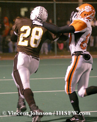 Caravan Freeze Jones, Run Clock Chicago (Gately Stadium) - On a cold night on the south side of Chicago, the Mt. Carmel Caravan were able to add a little extra chill to the air on defense, as they took down Edwardsville 27-7. The Caravan defense stopped the Tigers from getting any type of offensive drive together for most of the entire night and while the Tigers defense didn't give up any big plays, they were unable to stop the brown jerseys from marching down the field on 4 out of 6 possessions. The toughest of those 4 scoring drives would have to be the one the Caravan put together starting in the 3rd quarter. With Edwardsville scoring their only touchdown of the game on a 9 yard run by E.J. Jones, on a drive that started deep in their own territory. Mt. Carmel would take possession with 2:35 left in the 3rd and drive 80 yards over almost 9 minutes before Larry Dortch would punch the ball in for a 1 yard dive after the Tigers had stopped the Caravan on three previous plays just a few yards off the goal line. This score would put the Caravan up 20-7 with 5:48. Edwardsville started off their comeback hope at the 20 after a Scott Sarason kick off landed in the endzone for a touch back for the 3rd time on the night. The Tigers would only get 5 yards before turning the ball over on downs, leading to another Caravan, this time by Dominic Sulo from 2 yards out. Edwardsville went to a pass offense as their last hope to comeback with a minute & eleven seconds left, but James Jefferies would pick off a Joseph Allaria pass with just seconds left in the game to seal the victory for the Caravan. Derek Sulo also had an interception for teh Caravan stopping a Tiger's drive taht had started at the 28 and was at the mt. Carmel 35 when it ended. Dominic Sulo would finish the game with 3 rushing TDs for the game. by Vincent Johnson
