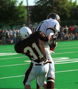 New King of the Hill Chicago (Gately Stadium) - In what has become "the event" of the high school football season since it was reintroduced 10 years ago after both Joliet Catholic & Mt. Carmel won state titles in their respective divisions. Has once again lived up to it's name. In front of a capacity crowd the Hilltoppers were knocked off their number one spot, by the only team that it would be fitting to do so. The Mt. Carmel Caravan. The game started out like most were expecting. Hard hitting, hard nose running, no frills basically. The Caravan would score first on a 11 yard run by Tom Brown. With a minute forty six remaining in the first quarter. The Caravan's defense was swarming as Nick Orlando and company made gaining any ground for JC difficult. Both J. R. Zwierzynski and Chris Gruber were fairly silent on the ground and Graig Tomasino was unable to connect with giant Mike Kolodziej. A missed Hilltopper field goal was as close to a score as they would get in the first half. Once the third quarter started so did the flood. Chris Goffer would catch a short pass and extend it for a total of 73 yards to start the Caravan's onslaught. Next would come a 32 yard rush by Greg Owens and a 26 yard fumble recovery and return for a touchdown by Niall Campbell, to put the Caravan up 28-0 with still six minutes left in the third. Catholic High would answer back by scoring 21 unanswered points on a Zwierzynski 2 yard punch up the gut with a little over a minute left in the third. Joliet would start the fourth off on a 47 yard Chris Gruber touchdown run. They would capitalize on a Ross Crampton fumble recovery right afterwards to score 3 minutes later on a Tomasino to Brett Hettman pass reception for a TD. With a seven point deficit, the momentum of the game had swung back in favor of the Hillmen, who looked like they might have some late game heroics in a come from behind victory, much like they had in the first game of this annual series 10 years ago, but that wouldn't be the case today. Owens would score again for MC and coach Frank Lenti's 200 career victory was secured when a tipped Tomasino pass was intercepted by linebacker Dan Brown with just under three minutes left.